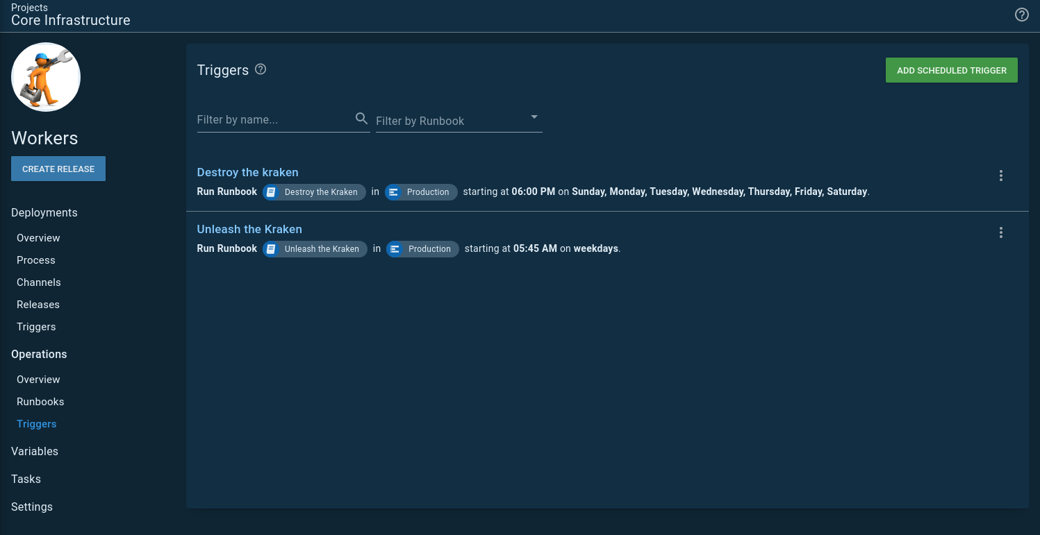 I have two scheduled triggers, one to spin everything up, and another to tear everything down. You’ll notice the teardown trigger runs every day while the spin up only runs on the weekends. That is just in case any infrastructure is spun up on the weekends: