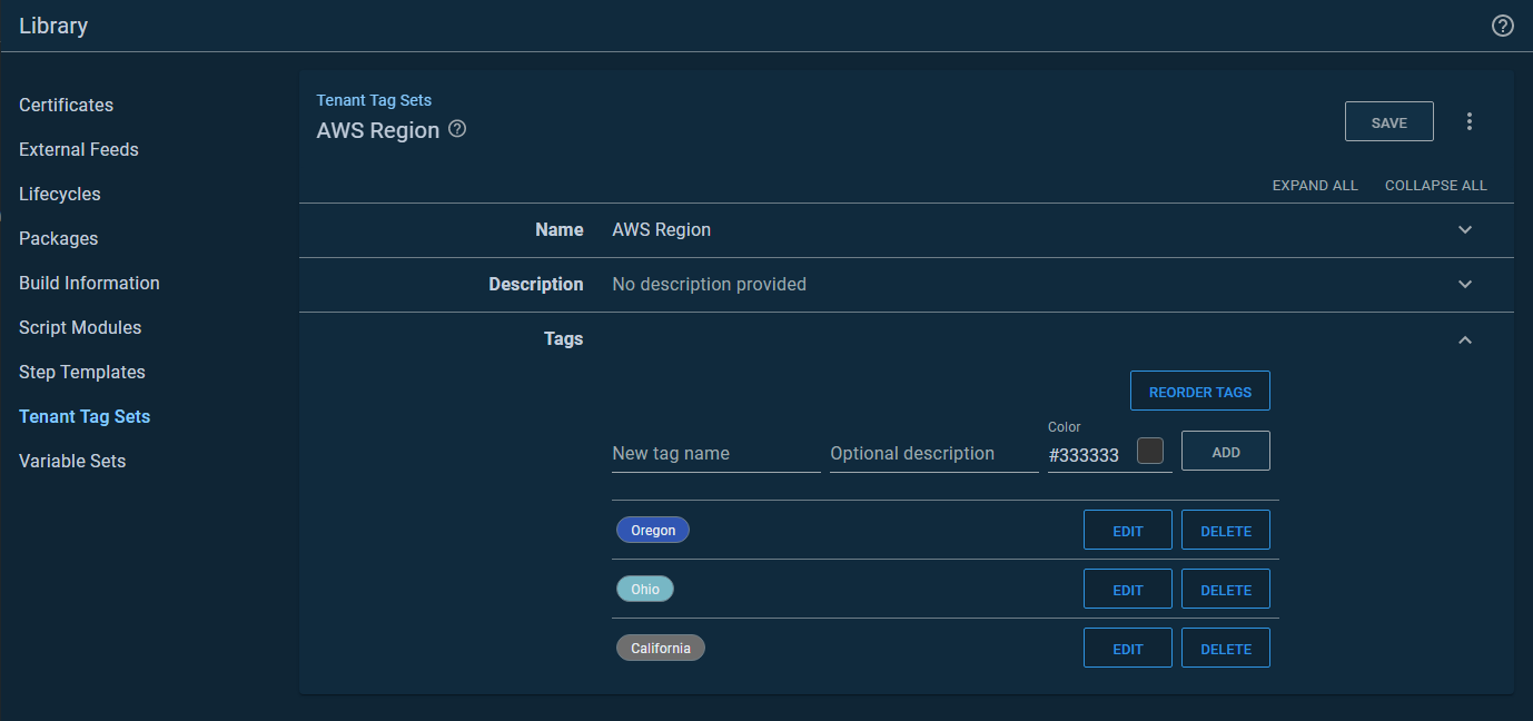 First, I created a tenant tag set called AWS Region: