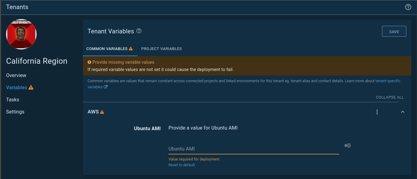 On the tenant variable screen, you’ll see a Common Templates tab. That variable template you added to the variable set will appear. The California region gave me the most heartache, which is why it has an image of Arnold screaming California: