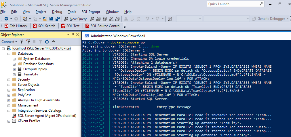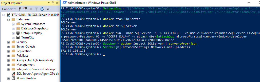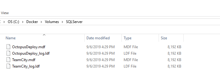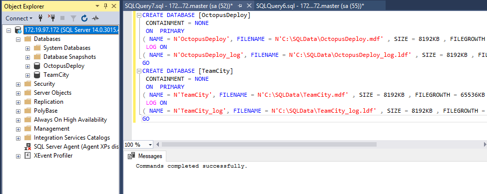 All the database create commands need to specify C:\SQLData\ as the directory for the data. Let’s say I want this SQL Server container to host the databases for Octopus Deploy and TeamCity. The commands are: