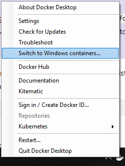 As I stated earlier, I am going to be using Windows based containers. After Docker Desktop has been installed, I need to switch over to Windows containers. That is done by right-clicking on the Docker Desktop icon in the taskbar and selecting Switch to Windows containers....