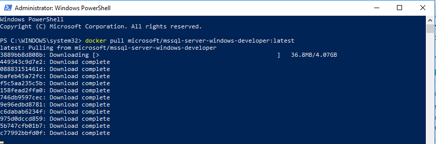 That list can seem quite daunting, especially if you are new to Docker. I want to take it one step at a time. First, let’s run a simple command to pull down the SQL Server Windows Developer image from Docker Hub: