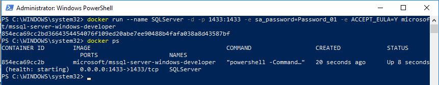 docker run --name SQLServer -d -p 1433:1433 -e sa_password=Password_01 -e ACCEPT_EULA=Y microsoft/mssql-server-windows-developer