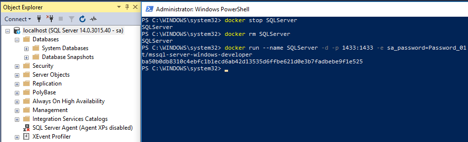 docker run --name SQLServer -d -p 1433:1433 --volume c:\Docker\Volumes\SQLServer:c:\SQLData -e sa_password=Password_01 -e ACCEPT_EULA=Y microsoft/mssql-server-windows-developer
