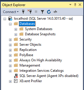 The SQL Server container is running, but how can we connect to it via SSMS from the host? In the run command I used the switch -p, which is short for publish. Essentially, the port 1433 was published to the host, which means we can access it via localhost. All I need to do to connect SSMS to my Docker SQL Sever is enter localhost, along with sa as the username/password defined above.