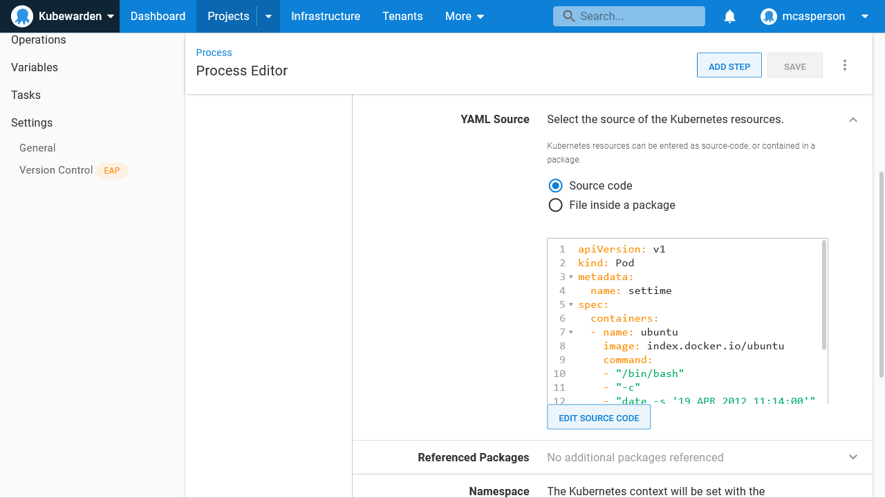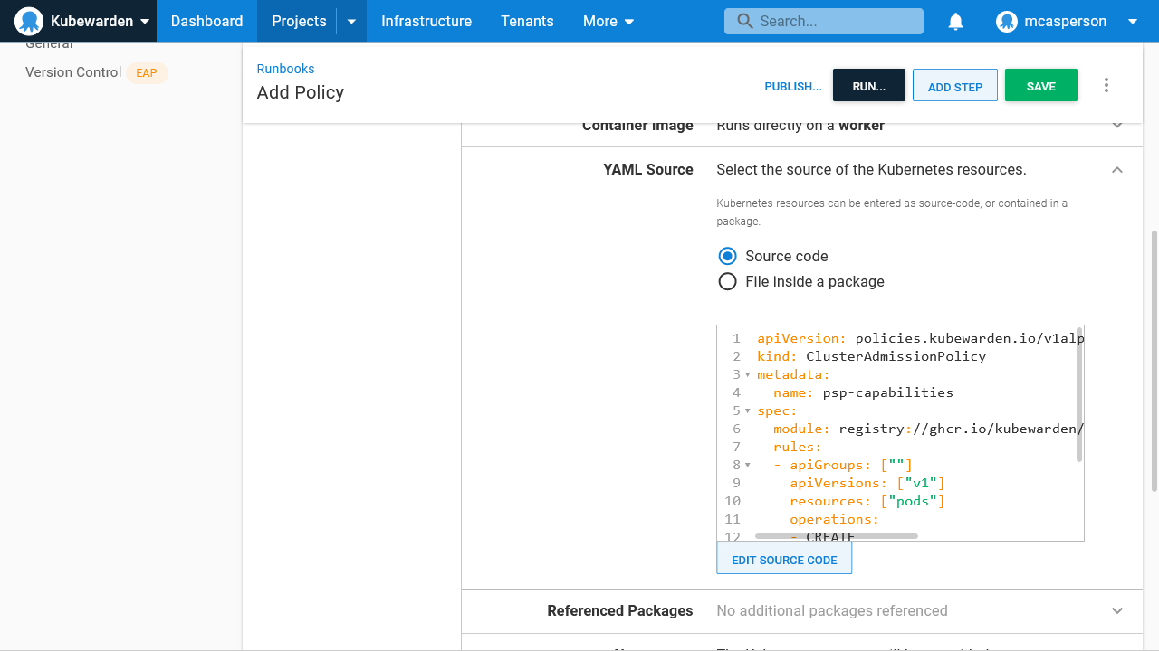 In this post you deployed Kubewarden using a Helm chart, deployed a policy with the Deploy raw Kubernetes YAML step, and saw how a pod deployment that failed the policy’s rules was rejected, thus ensuring pods with a known invalid configuration could not be applied to the cluster.