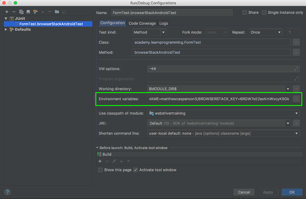 If we run this test, an exception may once again be generated about invalid credentials. If you recall, we previously defined the BrowserStack credentials as environment variables, but we did so against only a single test. It can get tedious adding these variables to each new test configuration, so to add these environment variables to all tests, we need to configure the default settings for all JUnit tests run by IntelliJ.