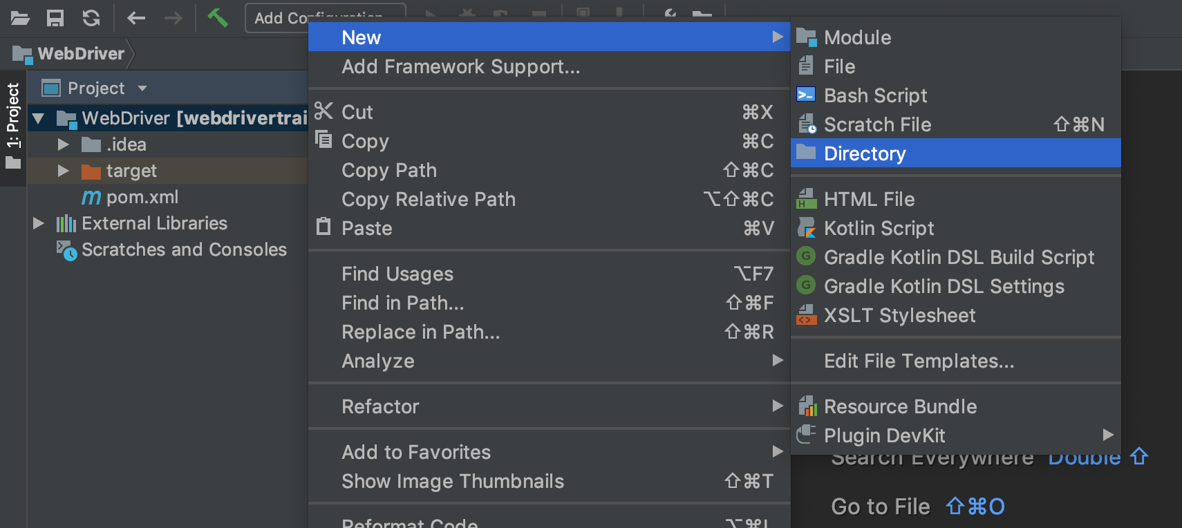 To create the new directory, right click on the top level project folder, select {{New,Directory}}.