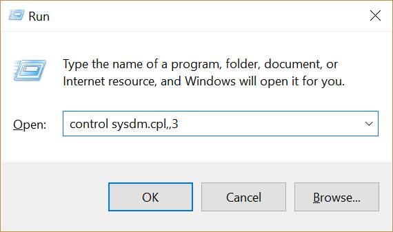 To see the system properties, click the Windows Key + R to open the Run dialog, and enter control sysdm.cpl,,3 as the command to run. Click the OK button.
