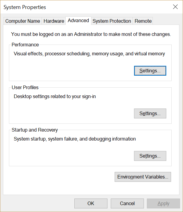 This will open the System Properties dialog box. Click the Environment Variables button.