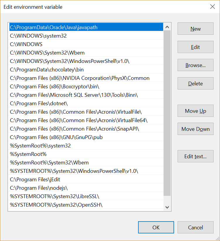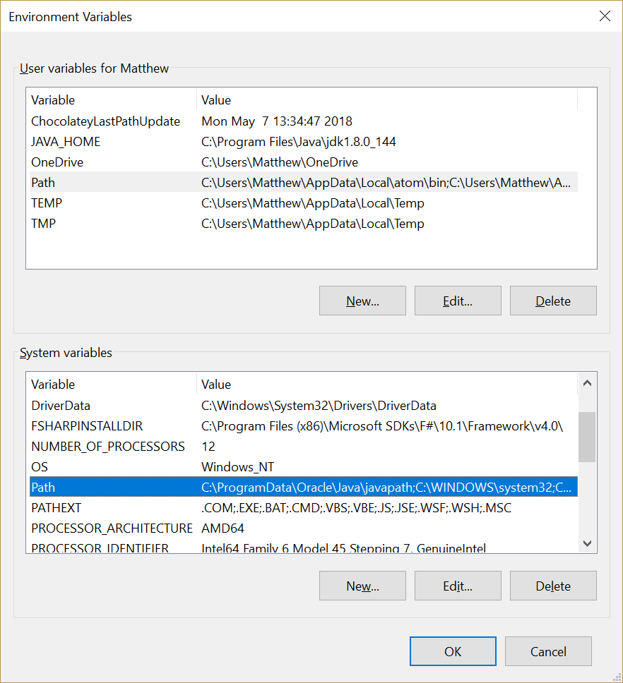 The environment variables are split between those at the top, which are specific to the current user, and those at the bottom, which are shared among all users. Both lists will have a Path variable. We’ll edit the System variables to ensure the driver executables are available for all users, so double click the Path item in the System variables list.