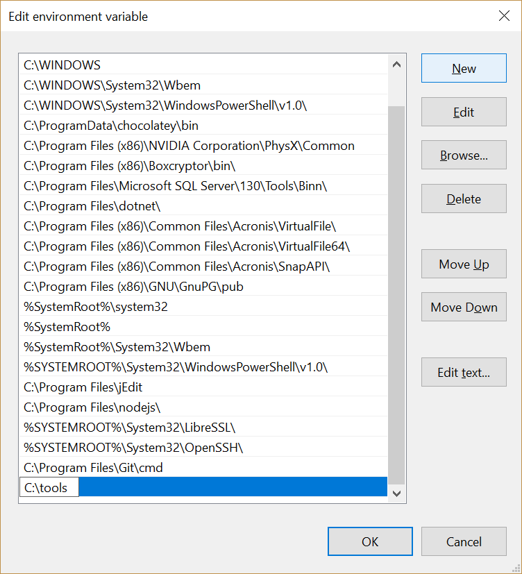 Add C:\tools to the list. Then click the OK button on all the open dialogs to save the changes.