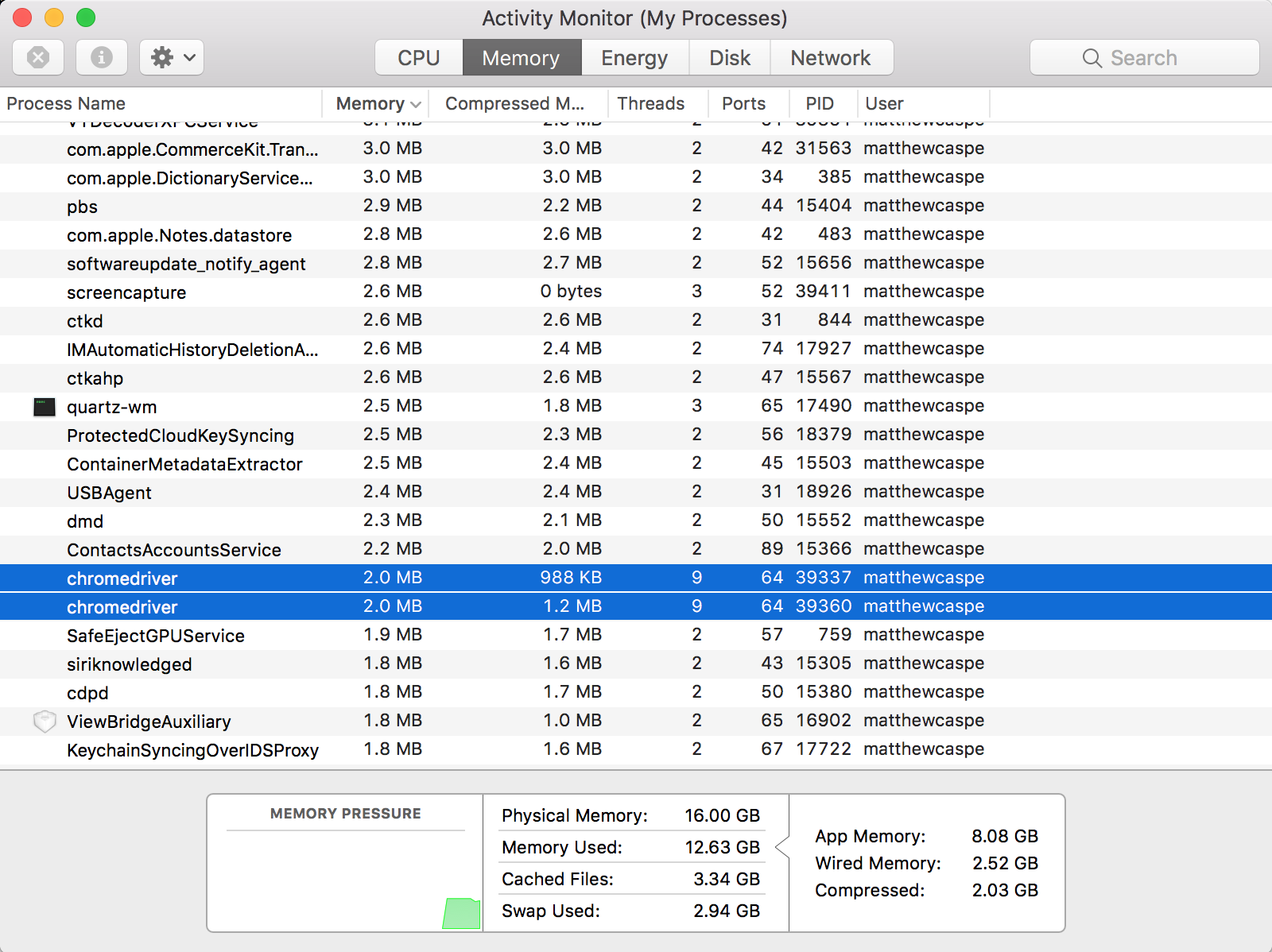 This screenshot shows the MacOS Activity Monitor, and in it we see instances of chromedriver have been left running after the test completed. These need to be manually closed to reclaim the resources they consume.