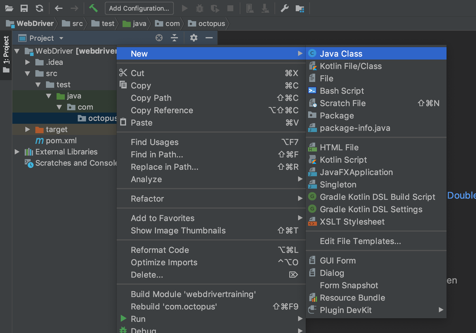 Inside the octopus directory we will create a class called InitialTest. To do this, right click on the octopus directory and select {{New,Java Class}}.