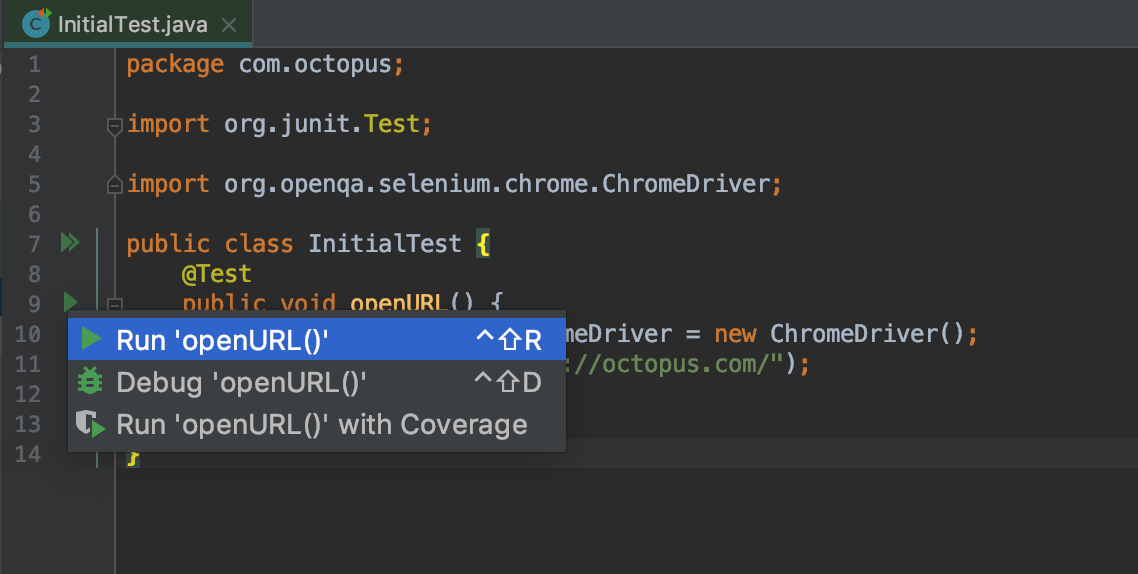 To run the test in IntelliJ, click the green icon next to the openURL method and click Run openURL().