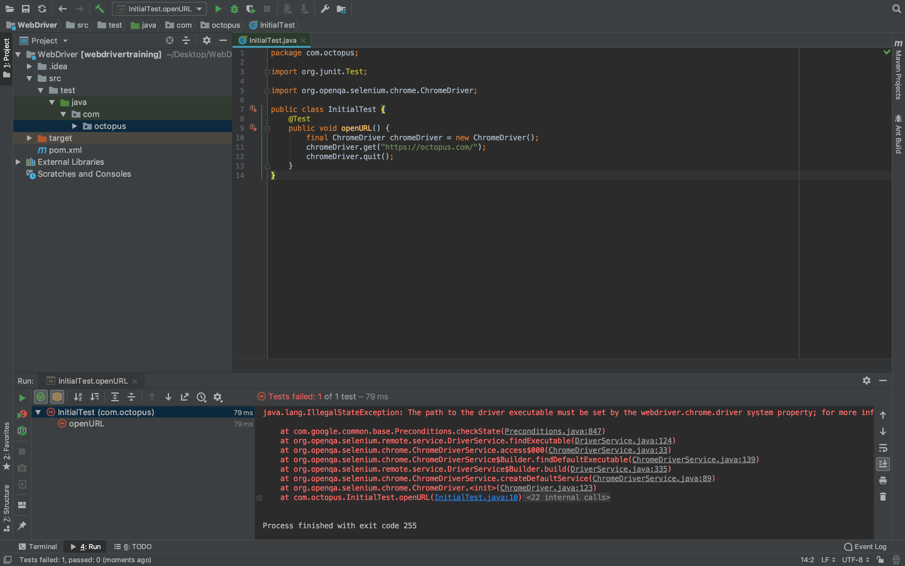 So at this point, we can run the test without error. You will notice the Chrome browser launch, open up https://octopus.com/, and close again. We have now successfully run our first WebDriver test.