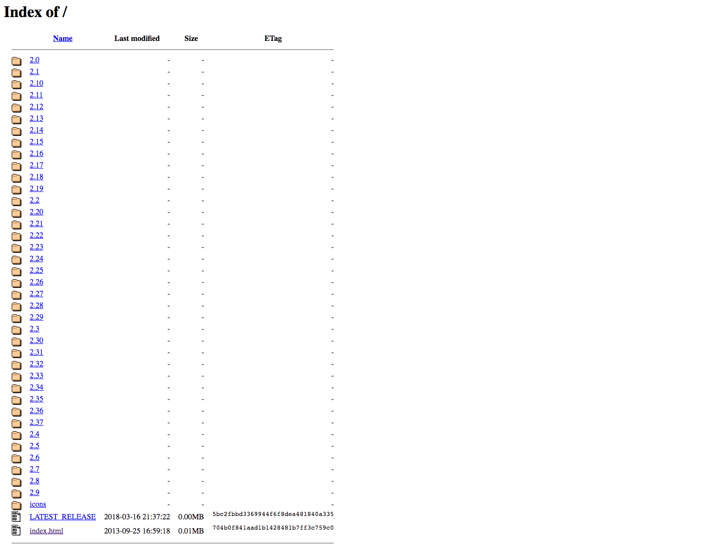 In the screenshot below, you can see that the directories are sorted using a string comparison, which results in version 2.4 appearing after version 2.37. However, from this list (and these versions will have changed by the time you read this) you actually want to download version 2.37 because this is the latest version available.