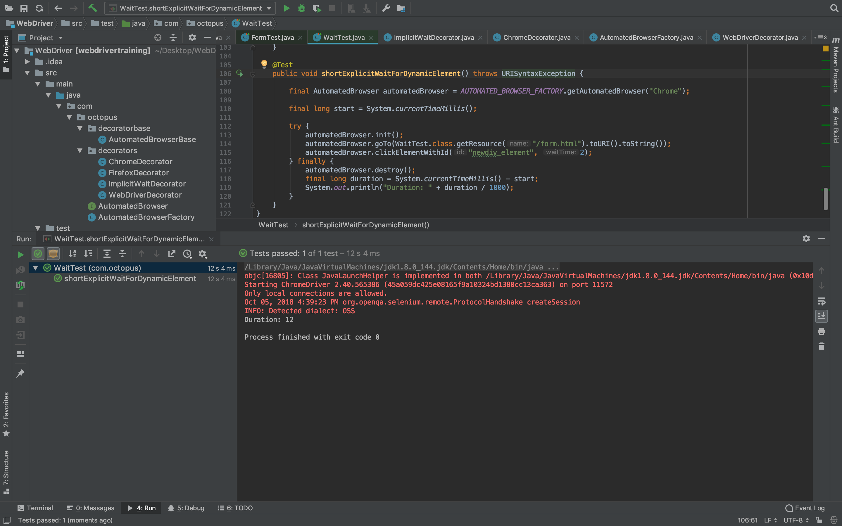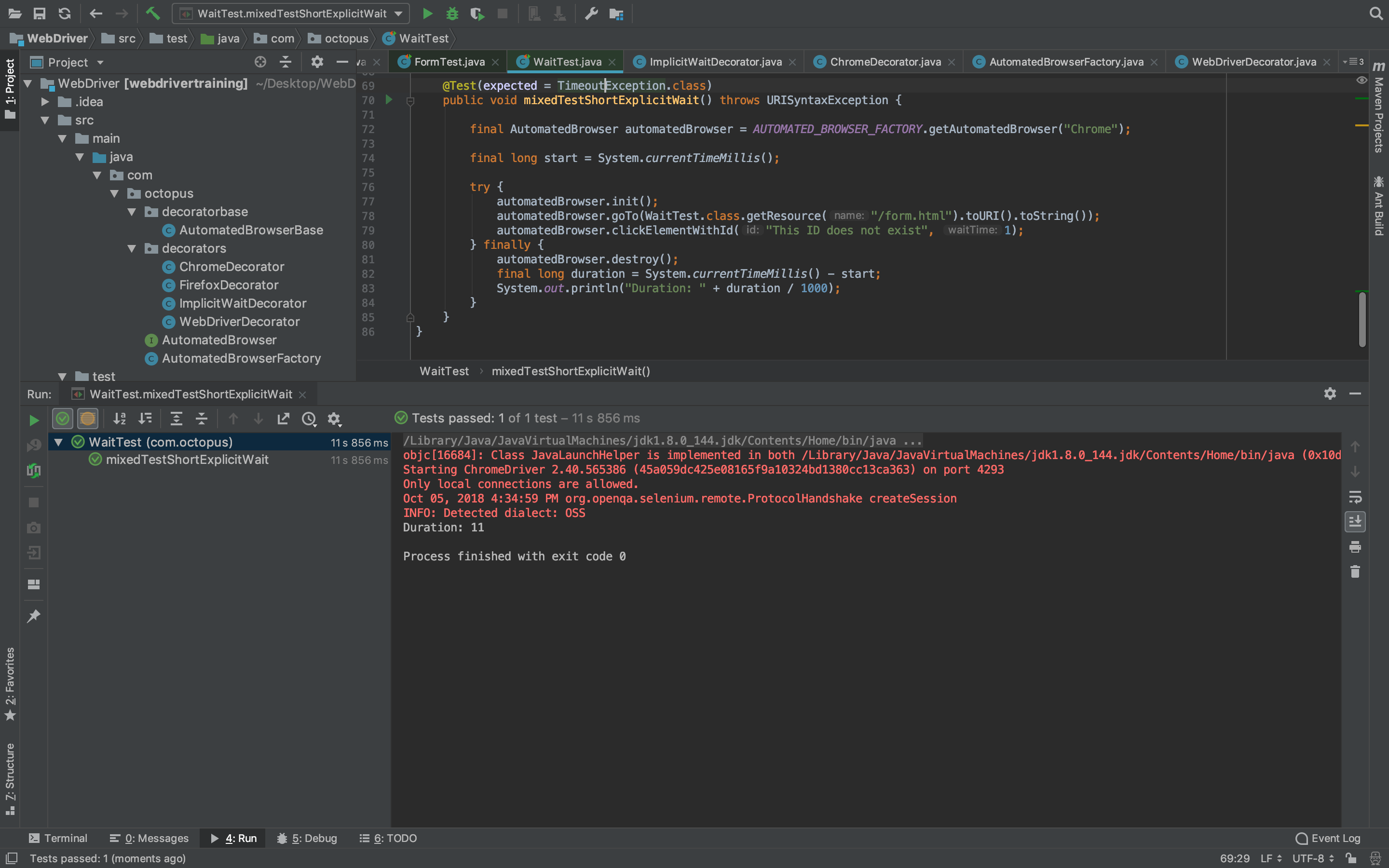 In our AutomatedBrowserFactory class, we have the ImplicitWaitDecorator class created as part of the construction of the AutomatedBrowser that opens a Chrome browser. So we know the test will make use of implicit waits: