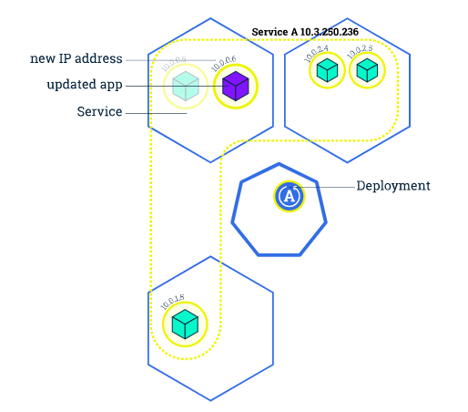 Kubernetes deployments ensure that only a certain number of pods are down while they are being updated. It does this by creating a new pod and destroying the old ones after it has completed.
