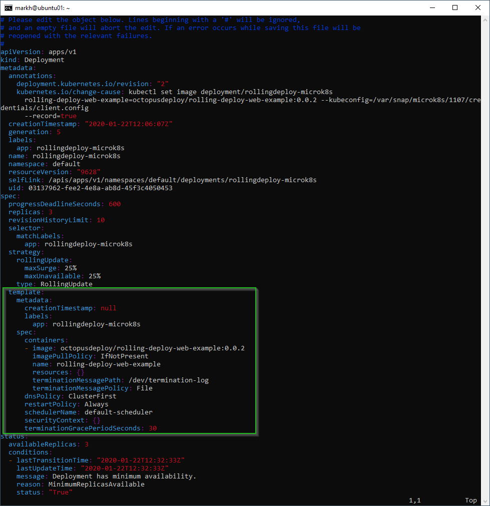 This opens the template file in a text editor. For me, that’s in the terminal itself. You can edit this file interactively. Changing the deployment pod’s template (the section within .spec.template) will result in triggering the deployment’s rollout: