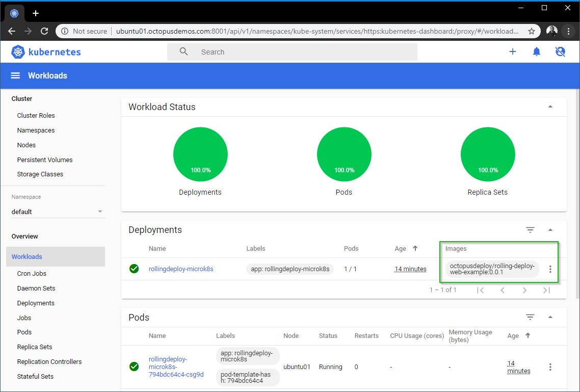 This shows us the Image is set to octopusdeploy/rolling-deploy-web-example:0.0.1 as we expected.