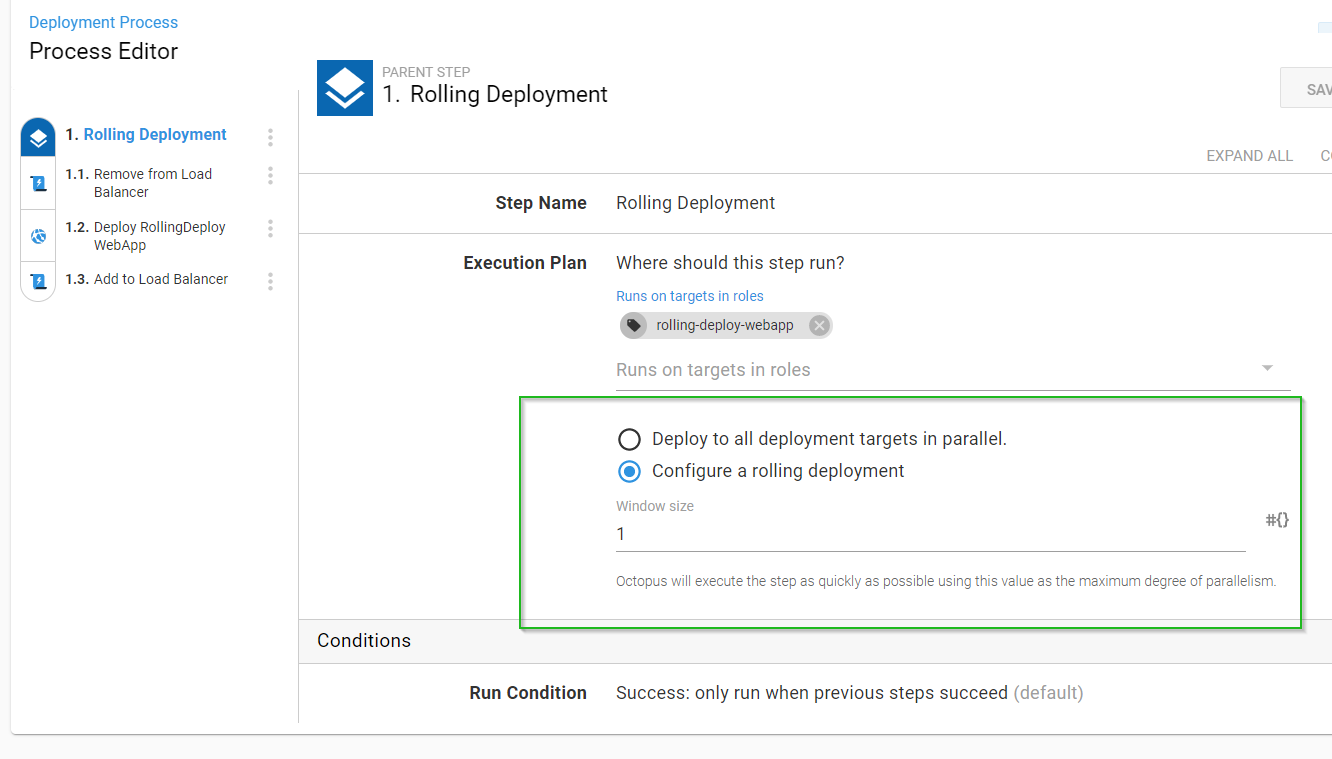 To achieve an incremental release in Octopus, we need to make our Window size lower than the total number of deployment targets. In my example, I set this to 1, as you can see below: