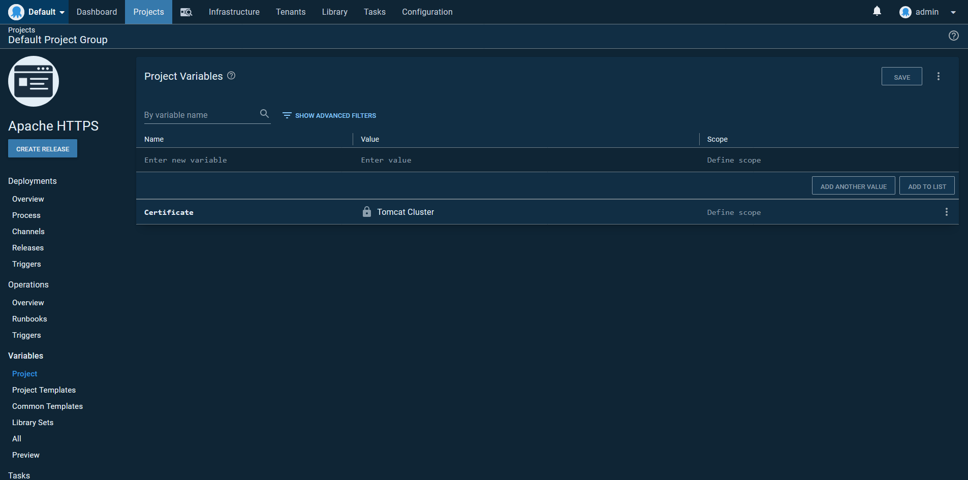 Create a new project in Octopus, and add the certificate we just uploaded as a variable: