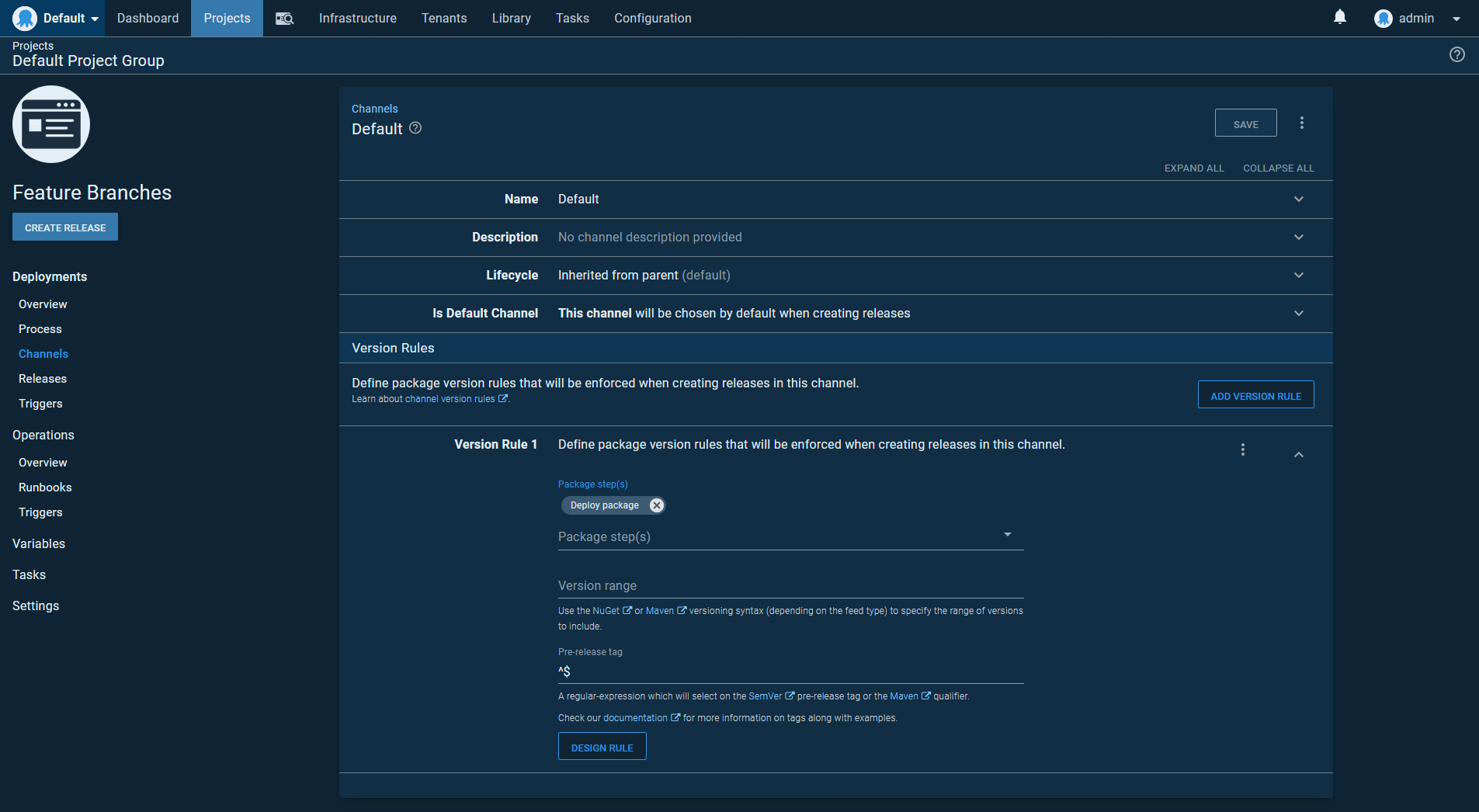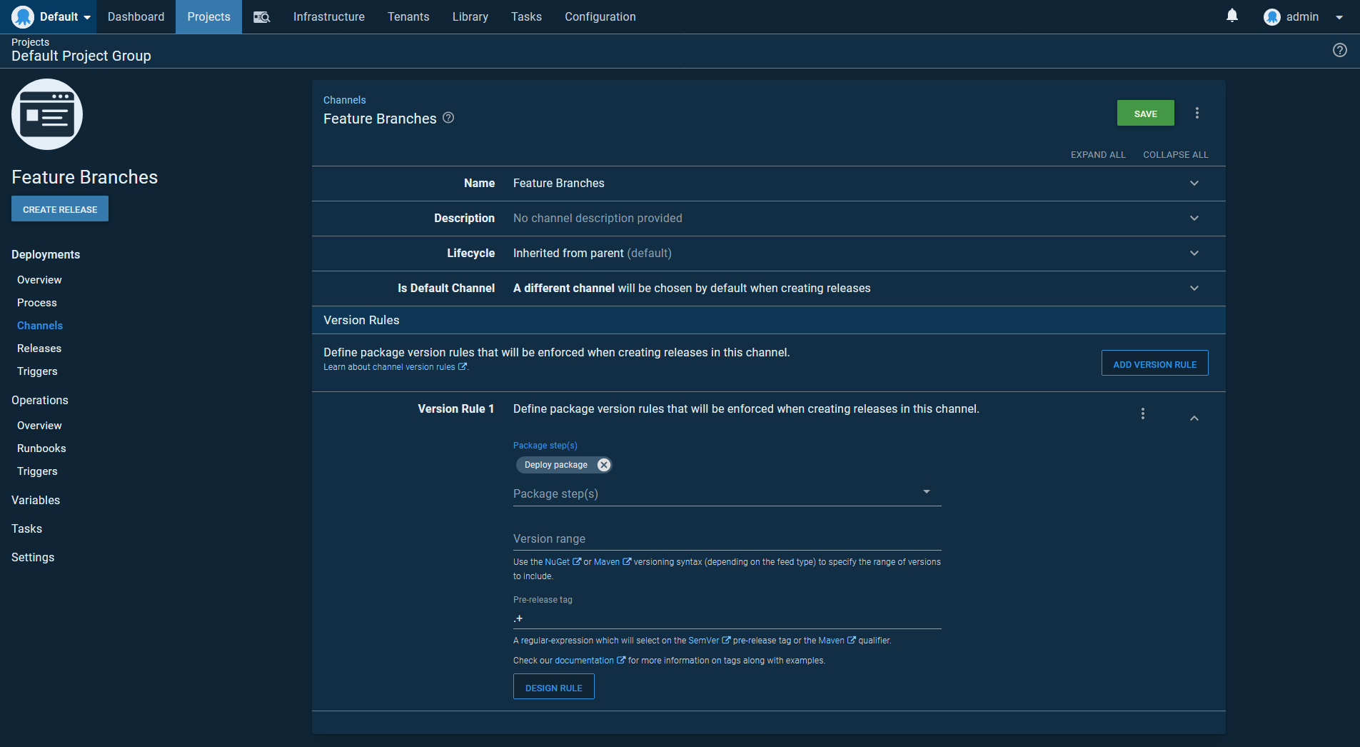Next, we have the feature branch channel, which defines a regular expression of .+ for the Pre-release tag field. This regular expression only matches non-empty strings, meaning the feature branch channel will only deploy artifacts with a pre-release or qualifier string: