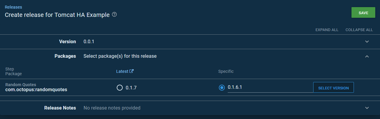 Here is the list of versions that Octopus allows a release to be created from in the default channel. Notice, the only version displayed has no qualifier, which we take to mean it is the master release: