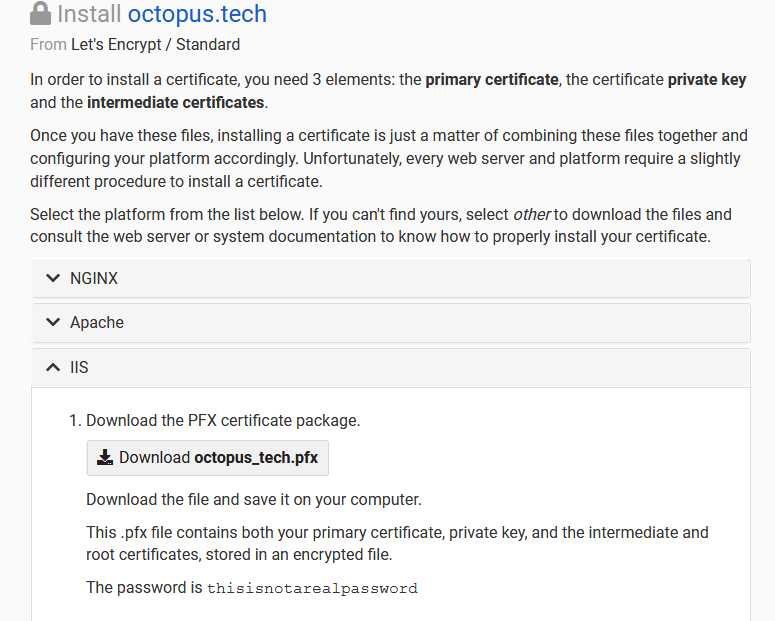 In the screenshot below, you can see the various options available for downloading the certificate. Note, while instructions and downloads are provided for Apache, we are downloading the PFX file provided under the instructions for IIS. PFX files contain the public certificate, private key, and certificate chain in a single file. We need this single file to upload the certificate to Octopus. Here we download the PFX file for the octopus.tech domain: