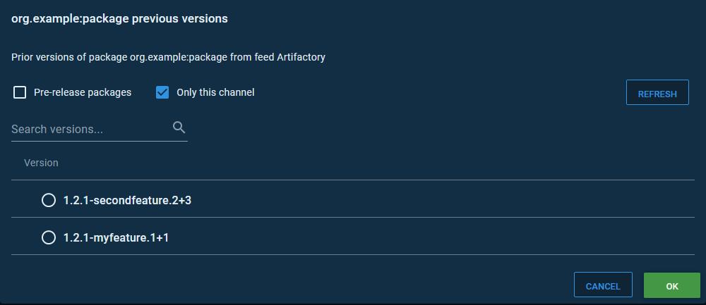 Here is the list of versions that Octopus allows a release to be created from using the feature branch channel. All of these versions have a qualifier embedding the feature branch name: