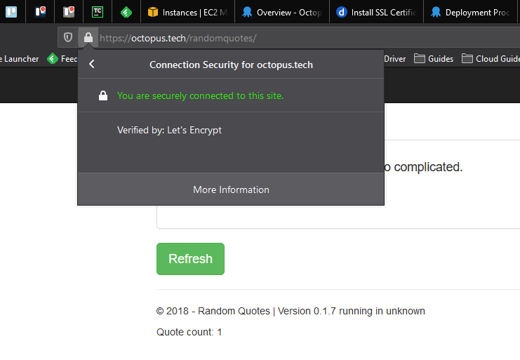 First, we need to upload the PFX certificate that was generated by the DNS provider. In the screenshot below you can see the Let’s Encrypt certificate uploaded to the Octopus certificate store: