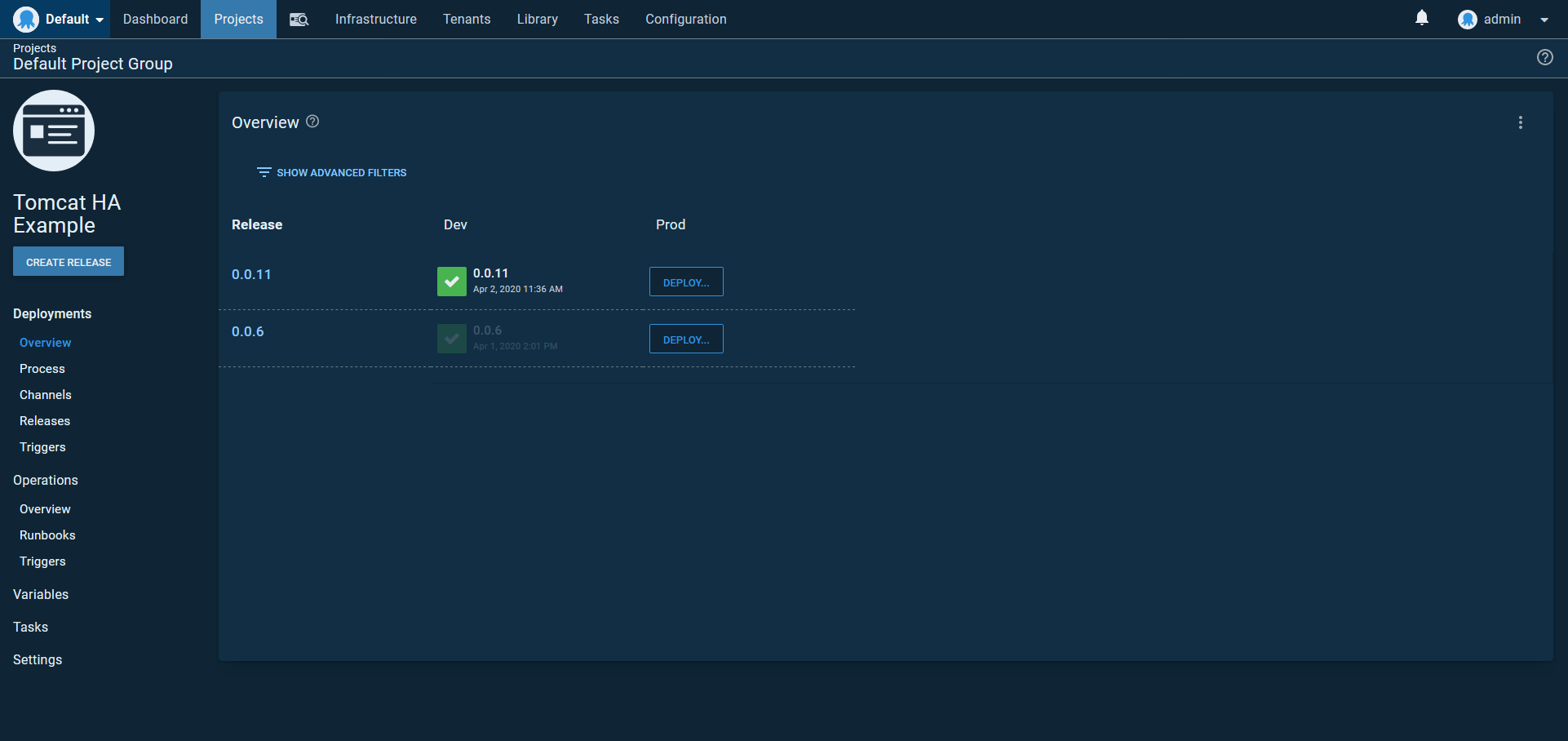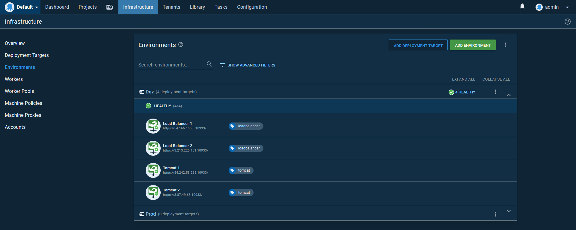 By associating the Tentacles assigned to the new Tomcat and load balancer instanced to additional environments in Octopus, we gain the ability to push deployments through to production: