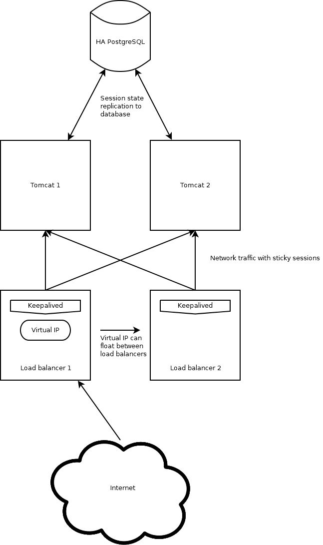 Because our infrastructure stack already assumes a highly available database, I’ll implement option two. This is arguably the simplest solution for us, as we do not have to implement any special networking, and we can reuse an existing database. However, this solution does introduce a delay between when the session state is modified and when it is persisted to the database. This delay introduces a window during which data may be lost in the case of hardware or network failure. Scheduled maintenance tasks are supported though, as any session data will be written to the database when Tomcat is shutdown, allowing us to patch the operating system or update Tomcat itself safely.