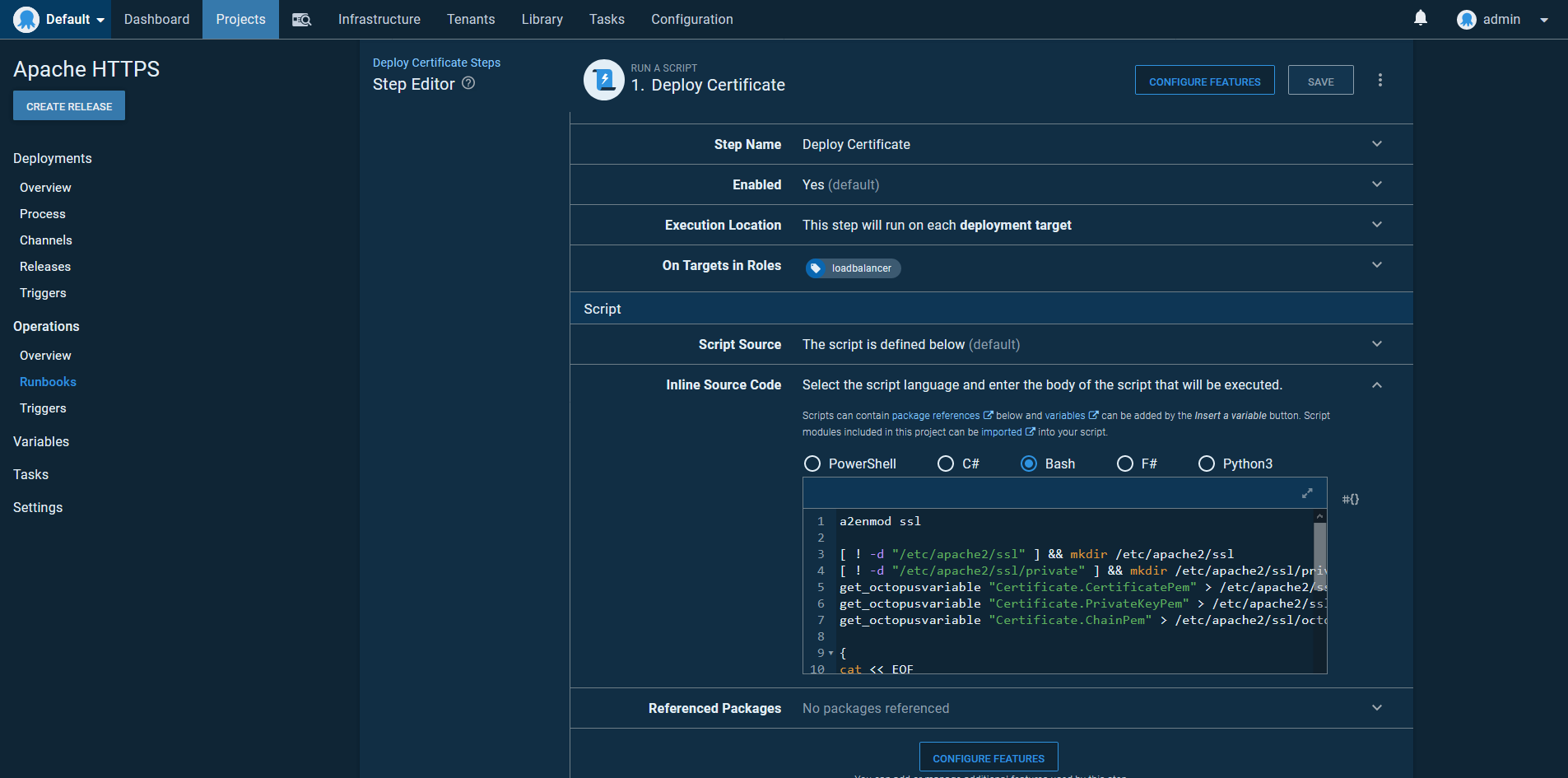 This makes deploying certificates a great use case for runbooks. Unlike a regular deployment, runbooks don’t need to progress through environments, and you don’t need to create a deployment. We’ll create a runbook to deploy the certificate to the Apache load balancers.