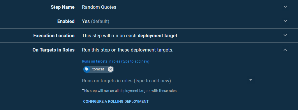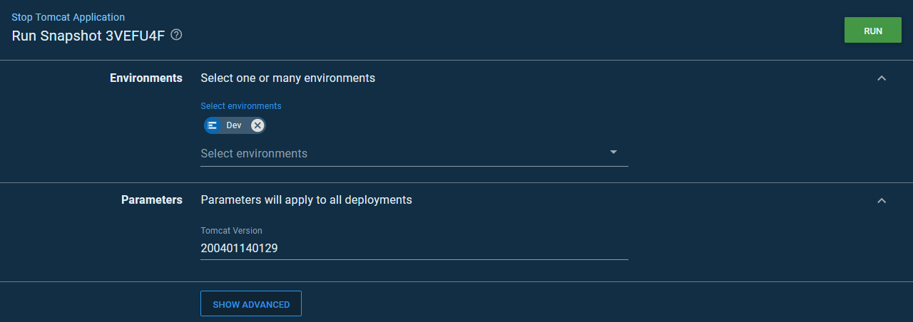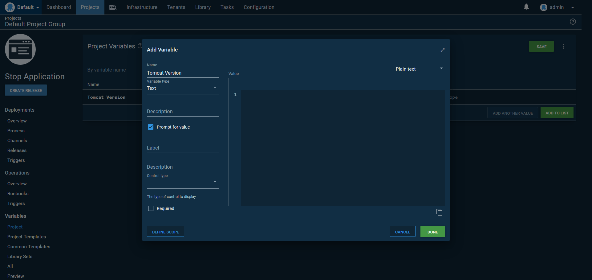 We start by adding a prompted variable that will be populated with the Tomcat version timestamp corresponding to the deployment we want to shutdown: