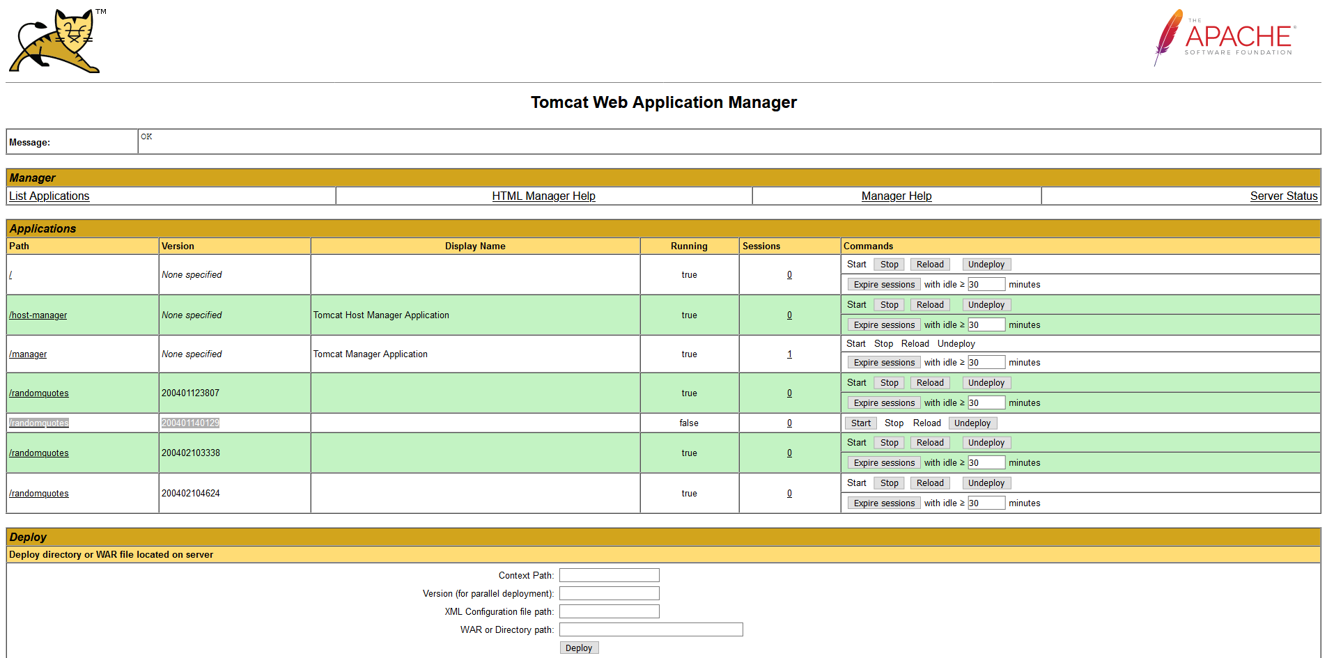 Tomcat has the ability to automatically clean up old versions that no longer have any sessions. We will not enable this feature though, as it may prevent a session for an old version from being migrated to another Tomcat instance.