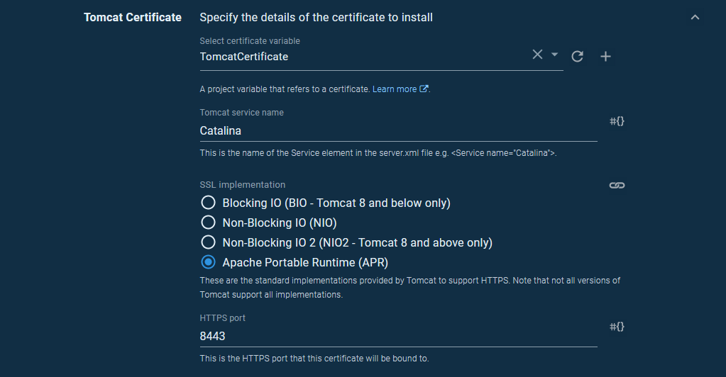 We reference a certificate variable for the Select certificate variable field. The default value of Catalina is fine for the Tomcat service name.