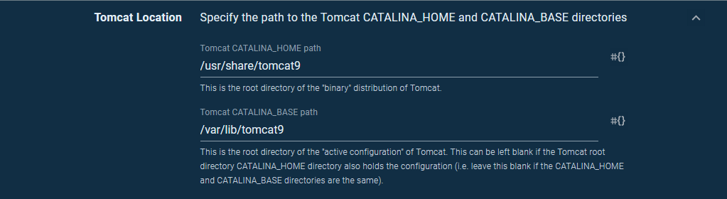 The Tomcat CATALINA_HOME path is set to /usr/share/tomcat9 and the Tomcat CATALINA_BASE path is set to /var/lib/tomcat9.