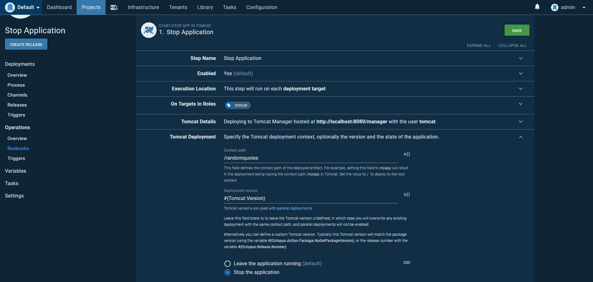 The runbook is then configured with the Start/stop App in Tomcat step. The Deployment version is set to the value of the prompted variable: