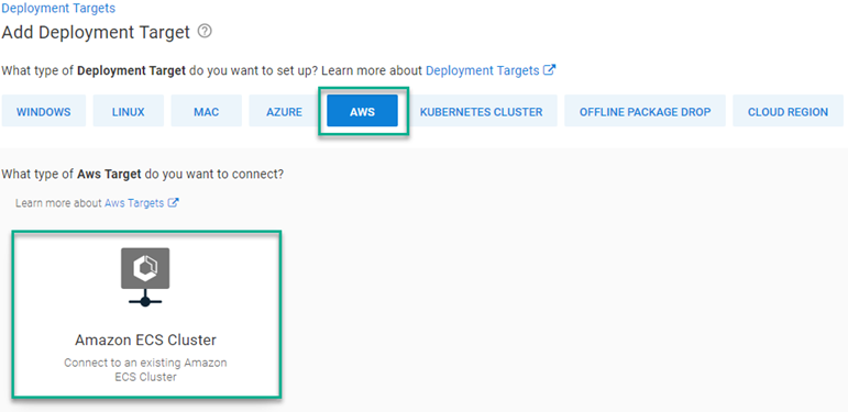 After you create the cluster, you need to add it to Octopus Deploy as a deployment target. When creating a new target, select the AWS category, then the new Amazon ECS cluster target.