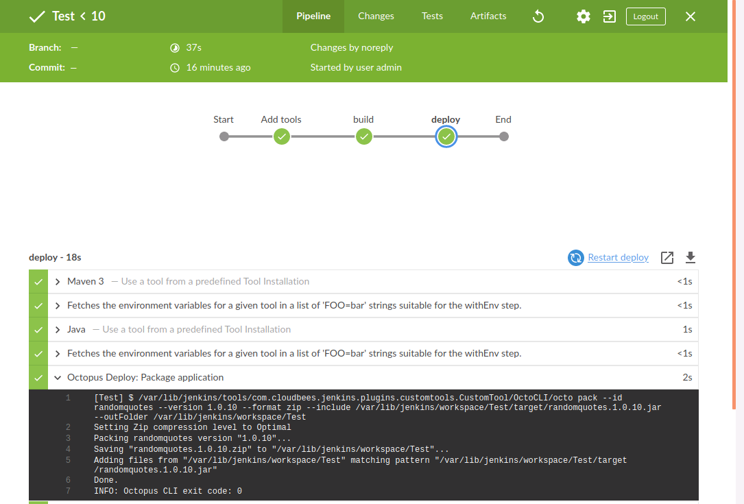 The first stage echoes the location of the custom tool called OctoCLI. Interestingly, the custom tools plugin is not defined in the tools section. This Jenkins issue has details about this limitation. But by calling tool('OctoCLI'), the custom tool is installed as part of the pipeline:
