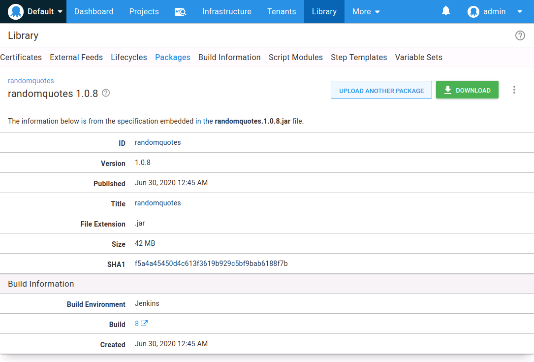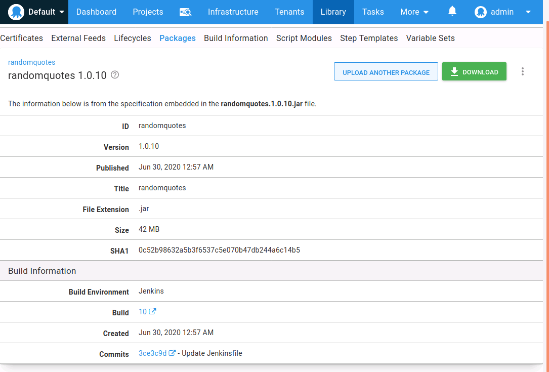 The pipeline above pushed two packages to Octopus. The first was the JAR file created by Maven. The second, pushed with the call to octopusPushBuildInformation, created and pushed a build information package. This package contains metadata about a package, including a link back to the Jenkins build and GIT commit information.