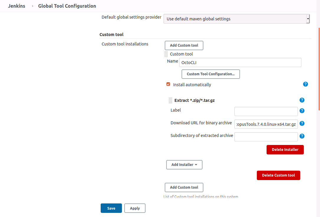 Give the new tool a name of OctoCLI, and supply the Octopus CLI download path for the Download URL for binary archive field, which will be a URL like https://download.octopusdeploy.com/octopus-tools/7.4.0/OctopusTools.7.4.0.linux-x64.tar.gz (visit the download page for the latest version):