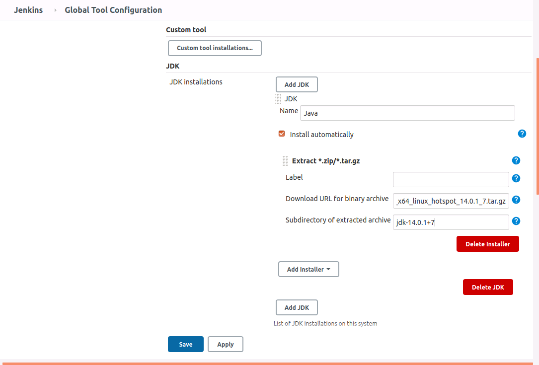 We’ll configure a JDK tool called Java and download the archive from https://github.com/AdoptOpenJDK/openjdk14-binaries/releases/download/jdk-14.0.1%2B7/OpenJDK14U-jdk_x64_linux_hotspot_14.0.1_7.tar.gz. Extract the subdirectory jdk-14.0.1+7 (which is just how AdoptOpenJDK packages paths in the archive):