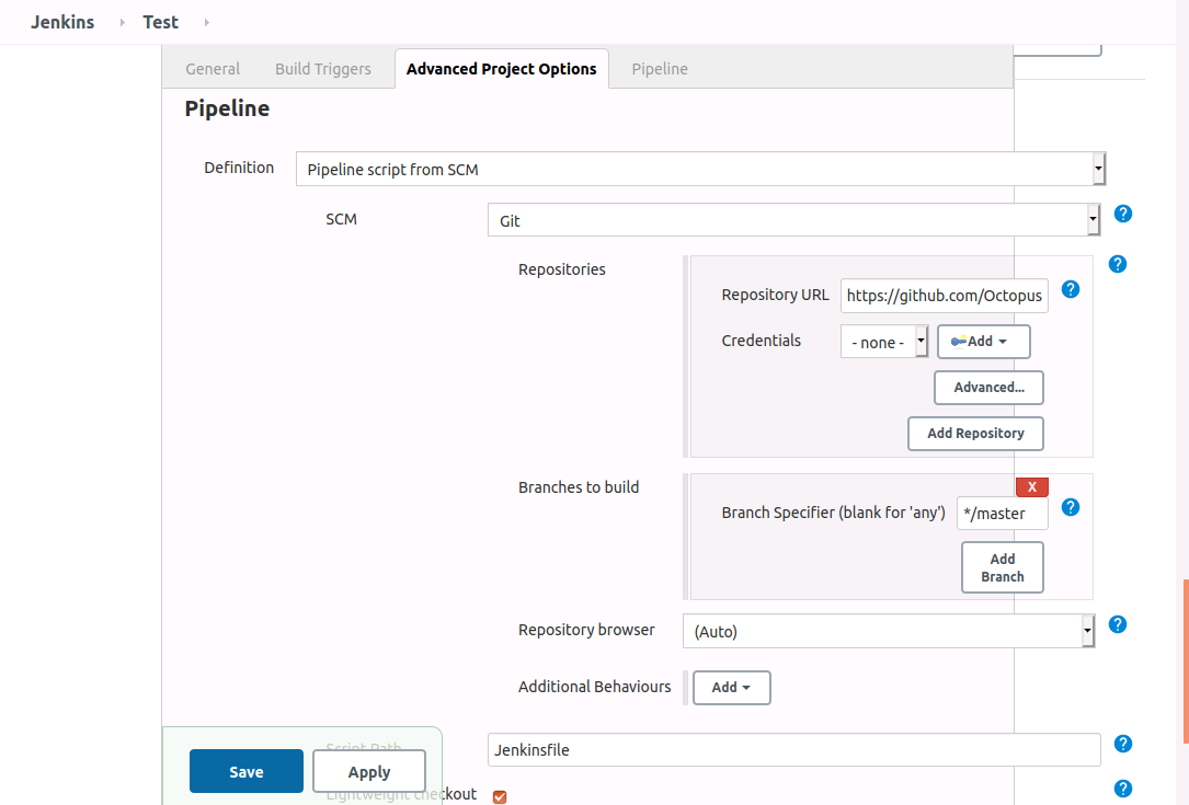 Building a pipeline sourced from a GIT repository is quite easy in Jenkins. Create a new Pipeline project, select the option Pipeline script from SCM, and set the Repository URL to https://github.com/OctopusSamples/RandomQuotes-Java.git: