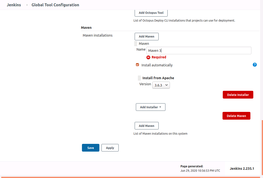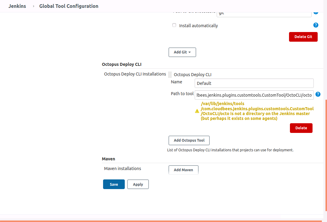 We have now configured the required settings to support the Octopus plugin. However, the sample Java application we will build requires two additional tools: Maven and a JDK. These are configured back in the Jenkins Global Tools Configuration page.