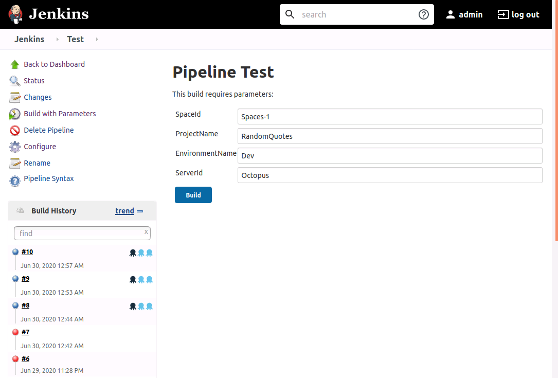 To make our Jenkinsfile generic, we expose all the Octopus specific variables as parameters. The first time Jenkins executes this pipeline, the default values will be used. Running the pipeline then adds these properties to the Jenkins project, meaning you will be prompted for them via the web UI when manually triggering the build a second time: