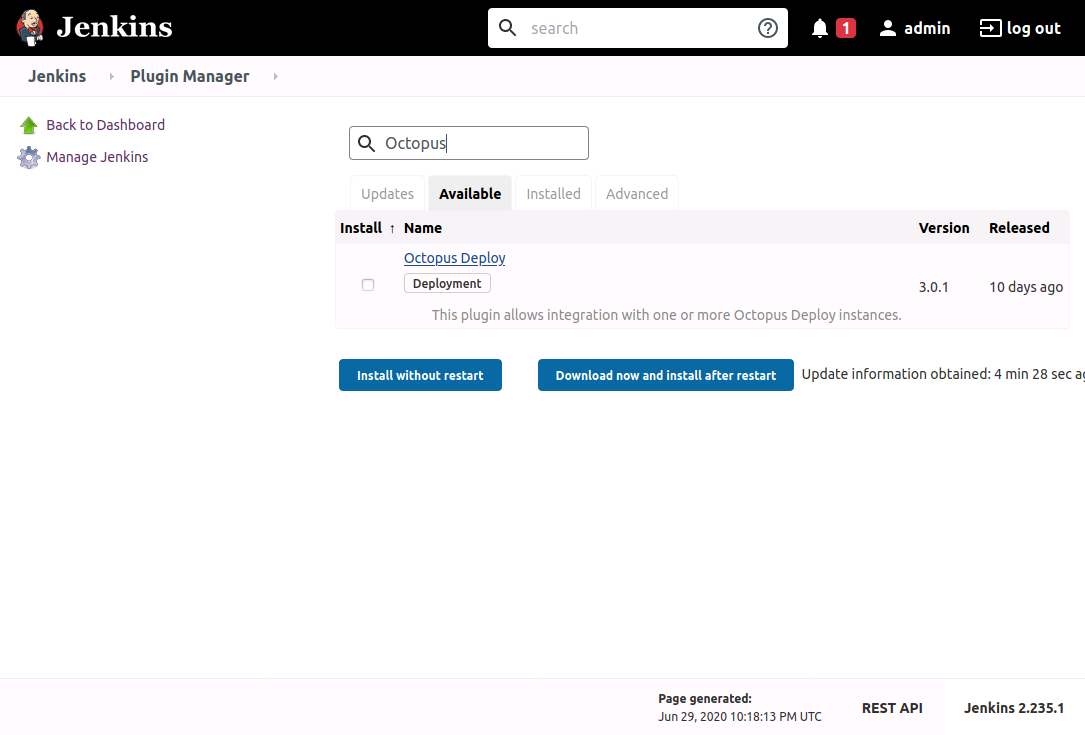 The Octopus plugin is available through the Jenkins Plugin Manager: